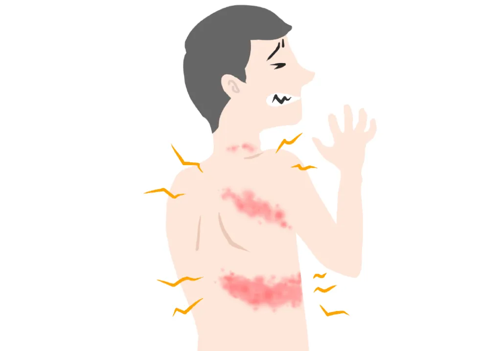 帯状疱疹とは、水膨れを伴う赤い発疹が身体の左右どちらか、帯状に出てくる皮膚の疾患です。